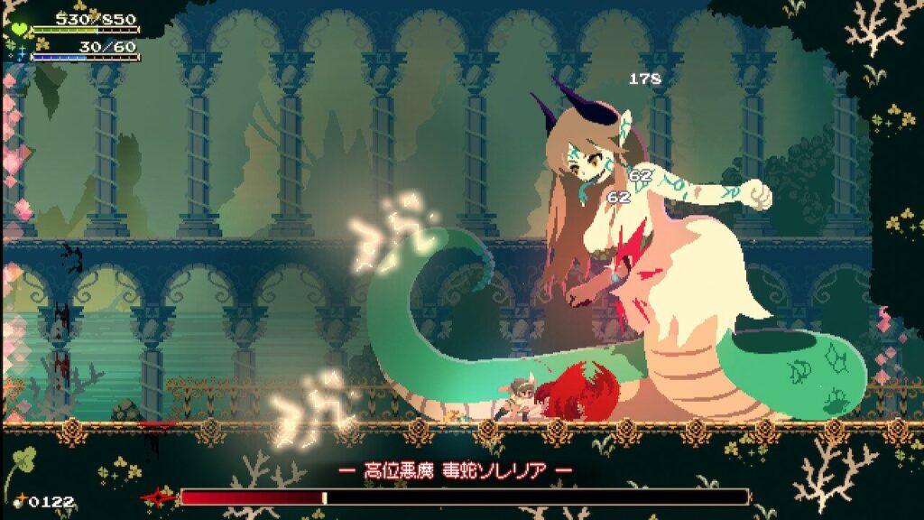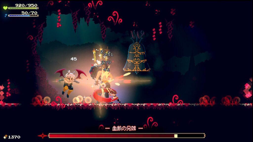 momodra月下から増えた大型ボスとのバトルも、ボスがさらに動くようになったため、非常に楽しいバトルとなっています。主人公と同じ等身のボスもより画面内をビュンビュン動き回ります。早くて追えない…。そして相変わらずの高難易度。一撃一撃が恐ろしく痛い…!