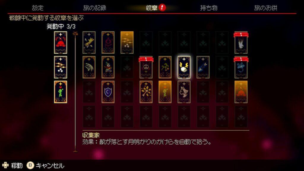 個人的に火力は下がるけど、少し離れた敵に攻撃ができるようになる紋章を付けて進むのが良かったです。本作は昔から攻撃範囲がせまかったので…(それもあったからか、今作ではコンボ攻撃の最後が少し離れた場所まで攻撃できるようになりました)。