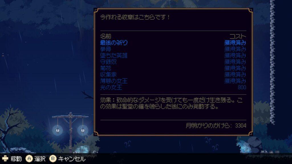 バトルではしっかり回避しつつ攻撃を当てていくことが重要になりますが、あまりに厳しい場合は、難易度を下げたり、セーブポイントである鐘の聖堂に硬貨扱いとなる月明かりのかけらをお供えすることで、体力と魔力が徐々に回復するバフが付けられるので活用しましょう。